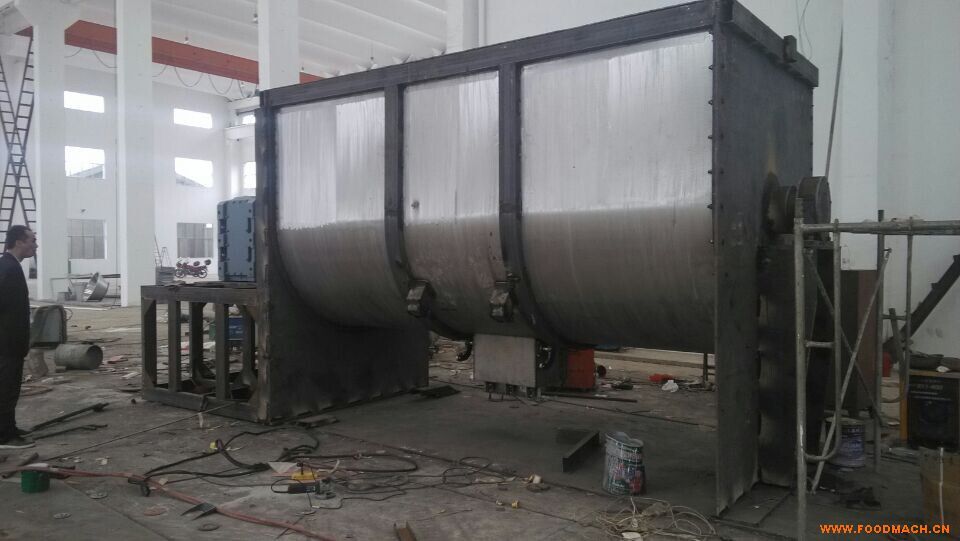 該機型由容器、螺旋攪拌葉片和傳動部件組成:螺旋葉片一般做成雙層或三層,外層螺旋將物料從兩側(cè)向中央?yún)R集,內(nèi)層螺旋將物料從中央兩側(cè)輸送,形成對流混合。