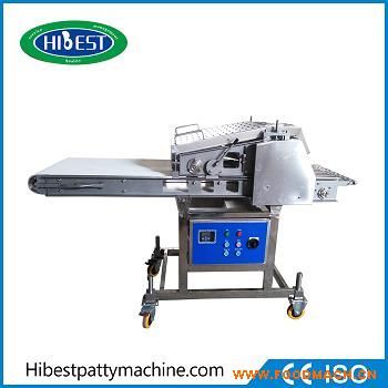 肉壓延機將新鮮或冷凍的原料肉經過4道壓輥壓延至規(guī)定的厚度,增加產品的表面積,達到相同的熟化效果情況下,縮短了油炸時間。牛肉壓整機是牛排、雞排、豬排理想的生產設備之一。