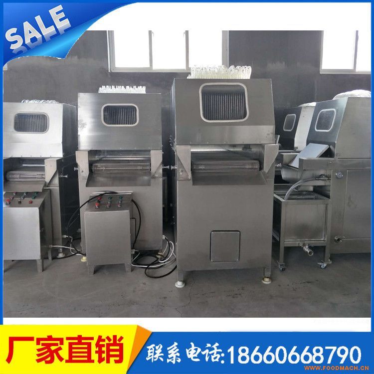 將鹽水注入肉中充分腌漬,注入配制的水溶液的肉塊能使肉質(zhì)嫩化,松軟,鹽水注射機提高了肉制品的品位和出品率?筛鶕(jù)不同工藝要求,調(diào)整步進速度,步進距離,壓肉板間隙及注射壓力,將腌漬液均勻連續(xù)地注入肉中,達到*理想的注射效果。本機采用不銹鋼材料設(shè)計合理,結(jié)構(gòu)嚴謹,操作方便,清洗方便,清潔衛(wèi)生,具有自動保護裝置,當注射針碰到硬物時注射針隨之抬起,不受損壞功能:將鹽水注入肉中充分腌漬,注入配制的水溶液的肉塊能使肉質(zhì)嫩化,松軟,提高了肉制品的品位和出品率。