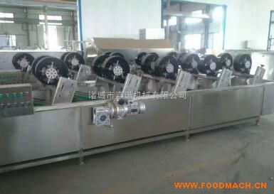 果蔬蒸煮漂燙風(fēng)干流水線原理:蔬菜漂燙殺菌作業(yè),在食品、飲料、制藥等行業(yè)中,要求對(duì)一些包裝完畢的產(chǎn)品進(jìn)行水浴滅菌。背包族的產(chǎn)品放在可調(diào)速的不銹鋼網(wǎng)帶上,在傳送帶的作用下按序進(jìn)人漂燙滅菌后,再有傳送帶帶入冷卻箱體內(nèi)均勻冷卻,從而達(dá)到產(chǎn)品殺菌要求。該系列設(shè)備連續(xù)運(yùn)轉(zhuǎn),已滅菌的包裝產(chǎn)品被源源不斷送人下一生產(chǎn)工序。