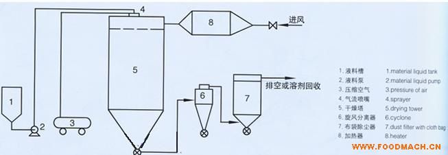 潔凈空氣加熱后進入干燥塔,在塔內(nèi)熱風中用二流體(或三流體)噴嘴將各種料液霧化成微小液滴,與熱風進行快速熱交換,蒸發(fā)掉液料中的水份(或溶劑),并隨熱風排出,得到粉狀產(chǎn)品。