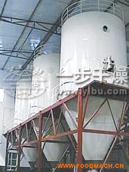 空氣經(jīng)過濾和加熱,進(jìn)入干燥器頂部空氣分配器,熱空氣呈螺旋狀均勻地進(jìn)入干燥室。料液經(jīng)塔體頂部的高速離心霧化器,(旋轉(zhuǎn))噴霧成極細(xì)微的霧狀液珠,與熱空氣并流接觸在極短的時(shí)間內(nèi)可干燥為成品。成品連續(xù)地由干燥塔底部和旋風(fēng)分離器中輸出,廢氣由風(fēng)機(jī)排空。