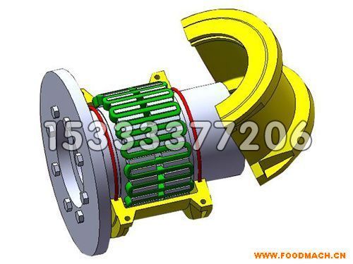 JSD型單法蘭聯(lián)接型聯(lián)軸器主要結(jié)構(gòu)是由兩個半聯(lián)軸節(jié),兩個半外罩,兩個密封圈及蛇形彈簧片組成。它是靠蛇簧嵌入兩半聯(lián)軸節(jié)的齒槽內(nèi)來傳遞扭矩,聯(lián)軸器以蛇形彈簧片嵌入兩個半聯(lián)軸節(jié)的齒槽內(nèi),來實現(xiàn)主動軸與從動軸的鏈接。運轉(zhuǎn)時,是靠主動端齒面對蛇簧的軸向作用力帶動從動端,來傳遞扭矩,如此在很大程度上避免了共振現(xiàn)象發(fā)生,且簧片在傳遞扭矩時所產(chǎn)生的彈性變量,使機(jī)械系統(tǒng)能獲得較好的減振效果,其平均減振率達(dá)36%以上。