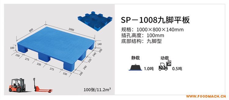 塑料九腳托盤的常見規(guī)格一般是1210,1008,1111,1010,1208等規(guī)格(1210指托盤長(zhǎng)1.2米,寬1米,其余的規(guī)格以此類推)。