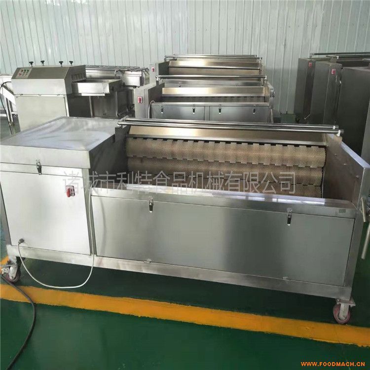 大姜清洗機(jī) 鮮姜清洗機(jī) 洗姜專用設(shè)備采用高壓噴淋和毛輥相結(jié)合,毛輥上面是軟毛刷,清洗干凈的同時不會對姜造成損傷,大姜進(jìn)到高壓噴淋水槽,在高壓噴淋水流下大姜被充分打散、翻滾、清洗、滾杠傳送,從物料層面洗脫的泥沙沉到底部隔離倉,不會發(fā)生回流造成二次污染,有效的清除蔬菜表面的污染物而且可以縮短清洗時間,省時、省力、省水、洗潔凈高、提高生產(chǎn)效率。