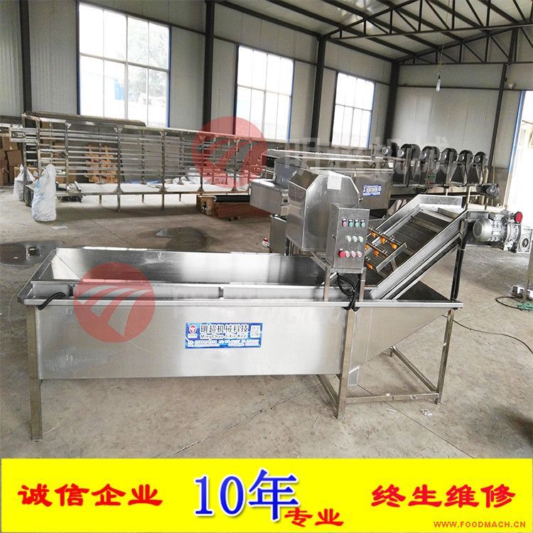 蔬菜清洗機(jī)設(shè)備除電機(jī)、軸承等標(biāo)準(zhǔn)件外均采用不銹鋼SUS304材料制作,完全符合出口食品衛(wèi)生要求。設(shè)備中設(shè)有氣泡發(fā)生裝置,使物料呈翻滾狀態(tài),去除產(chǎn)品表面農(nóng)殘功效,同時(shí)可加入適量的藥劑,進(jìn)行消毒固色,漂浮物可以從溢流槽溢出,沉淀物從排污口排出,以達(dá)到清洗的目的。氣泡清洗機(jī)是針對(duì)外形要求高的物料設(shè)計(jì),適用于:蔬菜、水果、水產(chǎn)品、中草藥等顆粒狀、葉狀、根莖類產(chǎn)品清洗、浸泡。