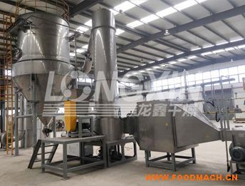 被干燥的物料隨高速高溫氣流進入旋風分離器,此時95%以上的物料被分離下沉進入集料倉,剩余的少量物料隨氣流進入脈沖布袋除塵器。氣流由濾袋外部進入,過濾后向上排出,為防止濾袋積料,由脈沖電磁閥定時,輪流由各濾袋上部輸入壓縮空氣反吹濾袋,物料的收率可達到99.5%以上。