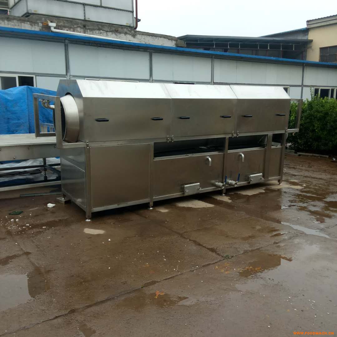 物料由進(jìn)料斗進(jìn)入落到滾筒內(nèi),隨滾筒的轉(zhuǎn)動(dòng)而在滾筒內(nèi)不斷翻滾相互摩擦,再加上噴淋水的沖洗,使物料表面的污垢和泥砂脫落,由滾筒的篩網(wǎng)洞孔隨噴淋水經(jīng)排水斗排出。由進(jìn)料口進(jìn)入清洗槽內(nèi)的原料,在兩個(gè)轉(zhuǎn)動(dòng)刷輥產(chǎn)生的渦流中得以清洗,同時(shí),由于兩個(gè)刷輥間隙較窄,故其間的水流有較高流速?gòu)亩搲毫档,被清洗物料在壓力差和刷輥摩擦作用下通過刷輥, 進(jìn)一步得到刷洗。