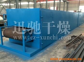 物料由加料器均勻地鋪在網(wǎng)帶上,網(wǎng)帶一般采用12-60目不銹鋼絲網(wǎng),由傳動裝置拖動在干燥機內(nèi)移動。干燥機由若干單元組成,每一單元熱風獨立循環(huán),部分尾氣由專門排濕風機排出,廢氣由調(diào)節(jié)閥控制,熱氣由下往上或由上往下穿過鋪滿物料的網(wǎng)帶完成熱量與質(zhì)量傳遞的進程,帶走物料水份。網(wǎng)帶緩慢移動,運行速度可根據(jù)物料溫度自由調(diào)節(jié),干燥后的成品連續(xù)落入收料器中。上下循環(huán)單元根據(jù)用戶需要可靈活配備,單元數(shù)量亦可根據(jù)需要選取。