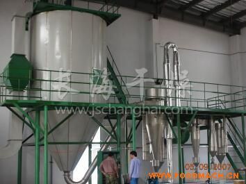 空氣經過濾和加熱,進入干燥器頂部空氣分配器,熱空氣呈螺旋狀均勻地進入干燥室。料液經塔體頂部的高速離心霧化器,(旋轉)噴霧成極細微的霧狀液珠,與熱空氣并流接觸在極短的時間內可干燥為成品。成品連續(xù)地由干燥塔底部和旋風分離器中輸出,廢氣由風機排空。