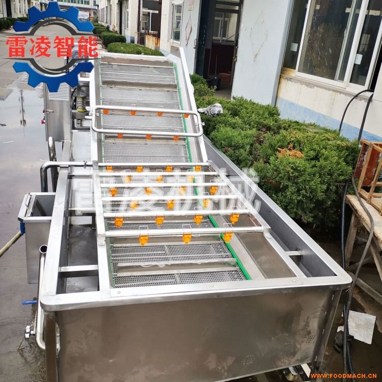 全自動(dòng)果蔬清洗機(jī)的作用力柔和,模擬了人工清洗的方式,同時(shí)又避免了人工清洗時(shí)不可避免的磕碰現(xiàn)象,對(duì)于嬌嫩果蔬的清洗有很好的保護(hù)作用。該清洗機(jī)在物料輸送過程中使物料在完成汽水浴清洗后,再經(jīng)過高壓噴淋清洗,該道工序的作用主要針對(duì)附著在產(chǎn)品表面的泥土。