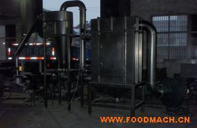 物料由料斗經(jīng)螺旋輸送器進(jìn)入粉碎室,被高速旋轉(zhuǎn)的刀片剪切粉碎,通過負(fù)壓風(fēng)運(yùn)的方法把物料運(yùn)入旋風(fēng)分離器、袋式除塵器,排除物料達(dá)到產(chǎn)品的要求。