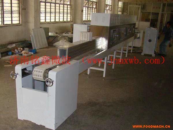 3、 微波加熱箱體部分:包括微波加熱箱體和電源箱體。采用1.5㎜厚、304#不銹鋼板制作微波加熱箱體,共計3個加熱箱。設(shè)有與箱體底部平齊的門,方便打掃箱體內(nèi)的衛(wèi)生,具有開門自動斷電保護裝置,并能防止微波泄漏。箱體底部沖有進風(fēng)孔,可用水沖洗加熱箱體。箱體內(nèi)設(shè)有拖輥保證輸送帶在箱體內(nèi)正常運行。頂部沖有排濕孔,留有排濕風(fēng)罩和法蘭。電源箱體裝有排熱風(fēng)罩及法蘭,側(cè)面沖有百葉窗。該機采用經(jīng)過大量理論和實踐而設(shè)計的相位互補形式多口饋能技術(shù),微波自上而下寬帶均勻饋入,從而保證磁控管完全正常運行,輸出匹配性能優(yōu)越,使被加熱物料更加均勻徹底。微波發(fā)生器等設(shè)置于加熱器之上,這樣使設(shè)備的電器使用壽命更長,電子器件及線路的布局規(guī)范,易于維修。