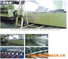 本成套設(shè)備由攪漿機(jī)、貯漿桶、上漿機(jī)、注料嘴、燃?xì)怃搸剿淼罓t、返回輸送網(wǎng)帶、切條裝置、夾心裝置、蛋糕翻條裝置、壓緊裝置、橫向切斷裝置、冷卻輸送等組成。 1.工藝順序 直接將漿料澆注在鋼帶上進(jìn)爐烘烤,成熟后成為坯帶狀,到終端鏟落后從下面返回輸送,此時(shí)已將蛋糕坯帶翻了身,待回輸?shù)阶⒘咸幭路綍r(shí),由斜坡提升到作業(yè)平臺(tái),進(jìn)行縱向切割成條,注上夾心料,一條間隔一條地將其翻轉(zhuǎn)過(guò)來(lái),壓在旁邊一條上面,再稍加壓緊,經(jīng)橫向切斷后便是市場(chǎng)上的食品新寵“歐派蛋糕”了 2.特點(diǎn) 用本設(shè)備做蛋糕可不用模具,只要更換切刀間隙擋圈和調(diào)節(jié)橫切刀的速度,使蛋糕規(guī)格可大可小,隨心所欲。 3.基本技術(shù)參數(shù) 生產(chǎn)能力5-6tons/day 功率:30KW 燃?xì)夂牧?20-25kg/hr 設(shè)備全長(zhǎng): 68M 全自動(dòng)切塊夾芯、瑞士卷蛋糕生產(chǎn)線 Full-automatic stripping and slicing grips core,Switzerland rolls up the cake production line 本成套設(shè)備是我廠研制開(kāi)發(fā)的能生產(chǎn)歐洲很流行一種軟蛋糕,口感松軟,易消化,產(chǎn)品檔次比較高,深受白領(lǐng)階層的青睞。 設(shè)備由攪漿機(jī)、貯漿桶、上漿機(jī)、注料機(jī)、鋼帶式燃?xì)馑淼罓t,反轉(zhuǎn)冷卻帶、切條注芯成型機(jī),冷卻輸送等組成。 |