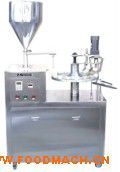 液體灌裝旋蓋機(jī)工作過程:人工將塑料瓶插入分度盤管座內(nèi)(16個(gè)工位),利用機(jī)械傳動(dòng)自動(dòng)轉(zhuǎn)位,光電檢測(cè),確認(rèn)有管開始自動(dòng)計(jì)量灌入管內(nèi)、然后通過電磁震動(dòng)盤進(jìn)行上蓋,專用電機(jī)旋蓋,能確保蓋子旋固到位。該機(jī)采用無(wú)級(jí)調(diào)速,光電控制,做到有瓶就灌,無(wú)瓶不灌。適用一般液體和瞬間膠的灌裝與旋蓋。
