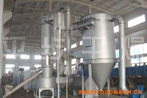 熱空氣由入口管以適宜的噴動速度從干燥機底部進入攪拌粉碎干燥室,對物料產(chǎn)生強烈的剪切、吹浮、旋轉(zhuǎn)作用,于是物料受到離心、剪切、碰撞、摩擦而被除數(shù)微;瑥娀藗髻|(zhì)傳熱。在干燥機底部,較大較濕的顆粒團在攪拌器的作用下被機械破碎,濕含量較低、顆粒度較小的顆粒被旋轉(zhuǎn)氣流夾帶上升,在上升過程中進一步干燥。由于氣固兩相作旋轉(zhuǎn)流動,固相慣性大于氣相,固氣兩相間的相對速度較大,強化兩相間的傳質(zhì)傳熱,所以該機生產(chǎn)強度高。酒糟專用閃蒸干燥機特點:● 多種加料裝置供選擇,加料連續(xù)穩(wěn)定,過程中間不會產(chǎn)生架橋現(xiàn)象。● 干燥機底部設(shè)置特殊的冷卻裝置,避免了物料在底部高溫區(qū)產(chǎn)生變質(zhì)現(xiàn)象。● 特殊的氣壓密封裝置和軸承冷卻裝置,有效延長傳動部分的使用壽命。● 特殊的分風裝置,降低了設(shè)備阻力,并有效提供了干燥器的處理風量。● 干燥室裝有分級環(huán)及旋流片,物料細度和終水份可調(diào)。(如碳酸鈣終水份可調(diào)節(jié)器至≤0.1%)● 相對其它干燥方法而言,可有效增加物料比重。● 干燥室內(nèi)周向氣速高,物料停留時間短,有效防止物料粘壁及熱敏性物料變質(zhì)現(xiàn)象,達到高效、快速、小設(shè)備、大生產(chǎn)。酒糟專用閃蒸干燥機適應(yīng)物料:● 無機類:硼酸、碳酸鈣、氫氧化物、硫酸銅、氧化鐵、碳酸鋇、三氧化銻,各種金屬氫氧化物,各種重金屬鹽、合成冰晶石等。● 有機物:阿特拉津(農(nóng)藥殺蟲劑)、月桂酸隔、苯甲酸、安息香酸、殺菌丹、草酸鈉、醋酸纖維素等。● 陶瓷類:高嶺土、二氧化硅、粘土。● 染料類:蒽醌、黑色氧化鐵、靛藍顏料、丁酸、氫氧化鈦、硫化鋅,各種偶氮染料中間體。● 食品類:大豆蛋白、膠凝淀粉、酒糟、小麥糖、小麥淀粉。
