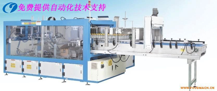 將輸送過來的瓶整理排列為規(guī)定形式后,輸送到供箱裝置提供過來的箱上,再形成左、右的成形,噴膠,封合等自動(dòng)包裝過程。