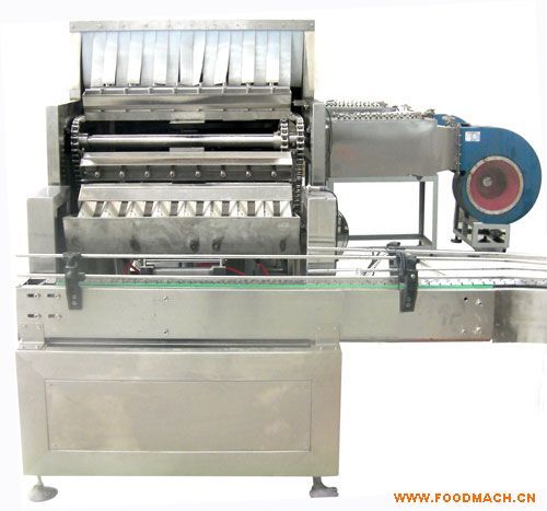 空玻璃瓶經(jīng)手工放置到輸送帶卡座上后,經(jīng)輸送帶送到?jīng)_淋區(qū)進(jìn)行1次、2次噴淋沖洗,同時進(jìn)行外瓶沖洗,然后進(jìn)入烘干區(qū)進(jìn)行烘干滅菌,送至翻瓶區(qū)后自動翻轉(zhuǎn)落至理瓶機(jī)上,經(jīng)灌裝輸送帶,轉(zhuǎn)至下道灌裝等程序。