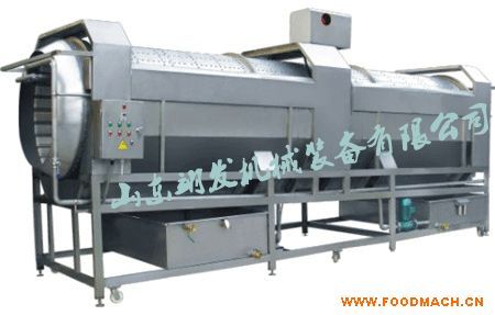 該設(shè)備由電機(jī)、水泵、滾筒、支架、托輪、板刷、噴淋水管、料斗、蓋板、水箱、閥門、傳動(dòng)軸、電機(jī)架、電氣控制開關(guān)等一些零部件組成。通過(guò)鏈條由電機(jī)鏈輪帶動(dòng)長(zhǎng)軸上鏈輪再由過(guò)渡軸的鏈輪和滾筒上的不銹鋼鏈條嚙合而使?jié)L筒實(shí)現(xiàn)轉(zhuǎn)動(dòng)。物料進(jìn)入滾筒后通過(guò)噴淋管沖洗以及板刷刷洗達(dá)到清洗效果,滾筒下方有兩個(gè)水箱,靠近出料的清水水箱,進(jìn)水管接清水,靠近進(jìn)料邊是循環(huán)水箱,從沖孔滾筒洗過(guò)物料出來(lái)的水源,經(jīng)過(guò)水箱中的過(guò)濾網(wǎng)二次利用。適用于根莖類蔬菜的清洗。