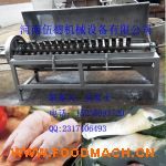 牛蹄去毛機(jī) ,打蹄機(jī) ,牛蹄脫毛機(jī),牛蹄刨毛機(jī)是近幾年為大中型屠宰廠設(shè)計(jì)研制生產(chǎn)的牛蹄刨毛專用設(shè)備,具有結(jié)構(gòu)簡(jiǎn)單、使用維修方便、脫毛率高等特點(diǎn)。牛蹄燙毛后可連續(xù)進(jìn)行工作,具有較高的生產(chǎn)效率。特別解決了刀切面帶毛而從未解決的問(wèn)題,提高了產(chǎn)品質(zhì)量。本機(jī)為臥式結(jié)構(gòu),主要由機(jī)架、筒體、主軸、噴水管組成,筒體內(nèi)周邊焊有螺紋鋼,減速機(jī)作為動(dòng)力源,通過(guò)鏈條傳動(dòng)帶動(dòng)主軸旋轉(zhuǎn),主軸上裝有撥動(dòng)橡膠板。 將燙好的牛蹄從加料口進(jìn)入該機(jī)后,由主軸帶動(dòng)撥動(dòng)橡膠板撥動(dòng)牛蹄在機(jī)內(nèi)轉(zhuǎn)動(dòng),通過(guò)周邊螺紋鋼對(duì)牛蹄磨擦而進(jìn)行脫毛,同時(shí)水管自動(dòng)噴水,從而達(dá)到刨毛清洗牛蹄的效果;牛蹄可連續(xù)進(jìn)入,脫毛后自動(dòng)排出,停機(jī)后將牛蹄放入清水池,重復(fù)操作,脫毛效果更加理想;脫毛后的牛蹄由出料口自動(dòng)排出,這樣減輕了工人勞動(dòng)強(qiáng)度,提高了工作效率。