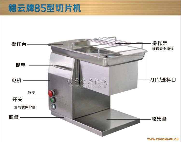 2015新款切肉機(jī)采用全不銹鋼材質(zhì)精致而成,美觀小巧,設(shè)計(jì)科學(xué)合理,新型帶齒不銹鋼切肉刀片有效地防止了切肉過程中的卡肉、粘連等現(xiàn)象的發(fā)生,產(chǎn)品操作平臺設(shè)計(jì)有斷電急停裝置,機(jī)器運(yùn)轉(zhuǎn)過程中,拆卸操作臺的同時會斷電停機(jī),以確保人身安全。機(jī)器上部操作盤可輕松拆卸,方便清洗,保證了安全衛(wèi)生的生產(chǎn)環(huán)境。這款85型切肉機(jī)可切新鮮豬肉、牛肉、豬皮等,鹵制品如豬臉肉、豬耳朵、熟牛肉、鴨慶子、熟牛肚。機(jī)器重量33kg,電壓220v,功率0.55kw,產(chǎn)量每小時250kg,整機(jī)尺寸450*330*420mm,切片厚度為2.5mm,可切片切絲切丁,是肉制品生產(chǎn)的專業(yè)設(shè)備。