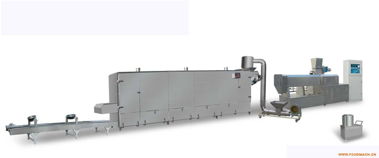 拌粉機(jī)→螺旋上料機(jī)→膨化機(jī)→振動(dòng)篩→風(fēng)送機(jī)→壓片機(jī)→風(fēng)送機(jī)→三層電烤箱→烤爐→提升機(jī)→高溫滾筒→噴糖機(jī)→提升機(jī)→七層八米烤箱→冷卻輸送機(jī)
