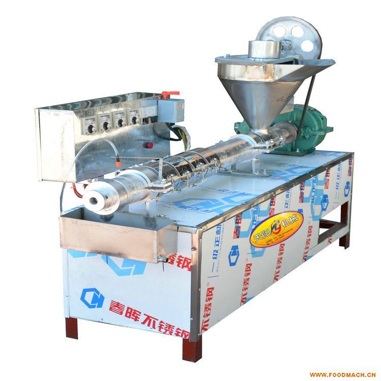 電熱自熟牛排豆皮機(干面皮機,干涼皮機、蛋白肉機)是在先進設(shè)備的基礎(chǔ)上研制的植物蛋白加工設(shè)備,該設(shè)備以冷榨豆粕為主要原料,經(jīng)粉磨、攪拌、調(diào)質(zhì)、高溫、擠壓,將大豆蛋白打開成鏈狀并重新組織化,形成筒狀,片狀或異型的蛋白肉食品,吸油、吸水、吸味,具有肉的狀態(tài)和口感,廣泛用于各類行業(yè)。有以下特點:1、大豆蛋白經(jīng)電加熱螺桿擠壓膨化,其蛋白質(zhì)分子重新排列,形成肉樣多孔組織,有優(yōu)良的保水性與咀嚼感;2、大豆蛋白在短時高溫、高壓力下加工,提高人體對蛋白的吸收消化能力,營養(yǎng)價值顯著增加;3、膨化時,由于出口處迅速減壓噴爆,可以除去大豆中的不良氣味并降低大豆蛋白質(zhì)食用后的產(chǎn)氣性;4、大豆蛋白肉有良好的保油性,用它做出食品干凈,不油膩;5、使用方便,用室溫水浸泡30分鐘,便可添加做成各種食品,對人體*有益,老少皆宜,食用方便,是各種涮鍋、火鍋、砂鍋、牛羊雜湯和多種麻辣燙的主要配料,可涼拌、熱炒、燉菜(肉),加入調(diào)料也加工成五香、麻辣等具有鮮明地方風味的即食產(chǎn)品,市場需求量大。天陽植物蛋白肉機采用四段數(shù)顯溫控裝置,自動加溫,通過專用減速機帶動螺旋擠壓噴爆器使蛋白質(zhì)受熱變性擠出成型,性能穩(wěn)定產(chǎn)品熟化好,產(chǎn)量高。天陽豆皮機TMP-80型時產(chǎn)80-100公斤,動力5.5KW,價格:自配電機5260元,重量180公斤,外型尺寸1800*500*1100mm。