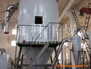 空氣經(jīng)過濾和加熱,進入干燥器頂部空氣分配器,熱空氣呈螺旋狀均勻地進入干燥室。料液經(jīng)塔體頂部的高速離心霧化器,(旋轉)噴霧成極細微的霧狀液珠,與熱空氣并流接觸在極短的時間內(nèi)可干燥為成品。成品連續(xù)地由干燥塔底部和旋風分離器中輸出,廢氣由風機排空。