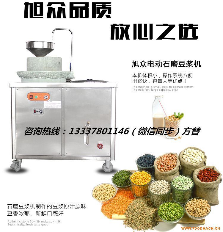 旭眾牌XZ-350電動(dòng)石磨豆?jié){機(jī)、石磨豆腐機(jī),采用古老石磨的原理,來(lái)制作現(xiàn)磨豆?jié){和豆腐。該機(jī)操作簡(jiǎn)單,方便快捷,是傳統(tǒng)制作豆腐技術(shù)和現(xiàn)在科技的*結(jié)合,實(shí)現(xiàn)豆?jié){制作的新突破,讓人輕松享受到*純正順滑的豆?jié){。石磨豆?jié){機(jī)、豆腐機(jī),廣泛適用于飲品店、茶餐廳、面包店、賓館酒樓和單位食堂等使用。