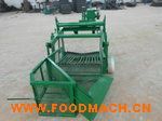 該機(jī)懸掛在手扶拖拉機(jī)后方,經(jīng)手扶拖拉機(jī)變速箱輸入軸右端安裝的鏈輪、鏈條傳至該機(jī)傳動軸,經(jīng)主傳動軸上偏心塊、連桿帶動挖掘鏟作前后往復(fù)運(yùn)動,再由傳動軸左端齒輪帶動過橋軸上變速齒輪,并改變傳動方向,再經(jīng)鏈條帶動分離排鏈主傳動軸,并由主傳動軸兩端偏心塊帶動振動篩上下抖動。在手扶拖拉機(jī)的牽引下,使挖掘鏟挖掘出來的馬鈴薯(大蒜、地瓜等)鋪放在分離排鏈上,在分離排鏈的轉(zhuǎn)動下土落在分離排鏈下方,馬鈴薯(大蒜、地瓜等)和未落下的土塊,在分離排鏈上面落在振動篩上,再次清選分離后集中鋪放在機(jī)后地面上。