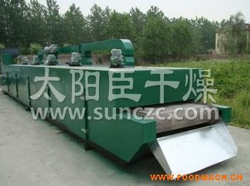 物料由加料器均勻地鋪在網(wǎng)帶上,網(wǎng)帶一般采用12-60目不銹鋼絲網(wǎng),由傳動(dòng)裝置拖動(dòng)在干燥機(jī)內(nèi)移動(dòng)。干燥機(jī)由若干單元組成,每一單元熱風(fēng)獨(dú)立循環(huán),部分尾氣由專門排濕風(fēng)機(jī)排出,廢氣由調(diào)節(jié)閥控制,熱氣由下往上或由上往下穿過鋪滿物料的網(wǎng)帶完成熱量與質(zhì)量傳遞的進(jìn)程,帶走物料水份。網(wǎng)帶緩慢移動(dòng),運(yùn)行速度可根據(jù)物料溫度自由調(diào)節(jié),干燥后的成品連續(xù)落入收料器中。上下循環(huán)單元根據(jù)用戶需要可靈活配備,單元數(shù)量亦可根據(jù)需要選取。