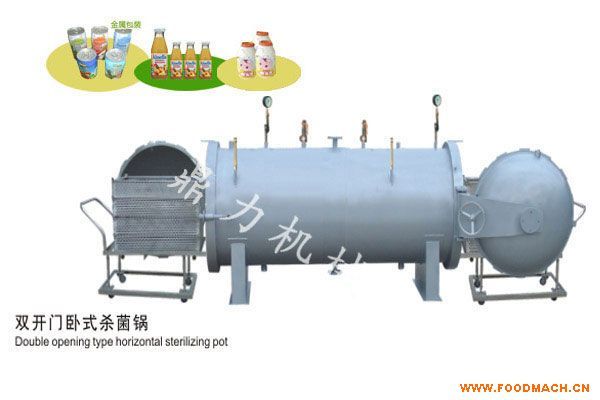 本機(jī)在物料殺菌之前,保證鍋體內(nèi)空氣干燥的情況下,可提前升溫,使鍋體溫度達(dá)到100攝氏度以上,縮短了殺菌時(shí)間,保證了物料的干濕度,雙開(kāi)門(mén)式殺菌鍋使用生產(chǎn)中流水線作業(yè)。