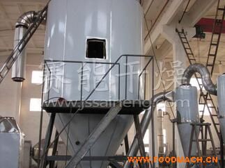空氣經(jīng)過濾和加熱,進(jìn)入干燥器頂部空氣分配器,熱空氣呈螺旋狀均勻地進(jìn)入干燥室。料液經(jīng)塔體頂部的高速離心霧化器,(旋轉(zhuǎn))噴霧成極細(xì)微的霧狀液珠,與熱空氣并流接觸在極短的時間內(nèi)可干燥為成品。成品連續(xù)地由干燥塔底部和旋風(fēng)分離器中輸出,廢氣由風(fēng)機(jī)排空。
