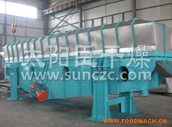 物料自進(jìn)料進(jìn)口進(jìn)入機(jī)內(nèi),在振動(dòng)力作用下,物料沿水平面流化床拋擲,向前連續(xù)運(yùn)動(dòng),熱風(fēng)向上穿過(guò)流化床同濕物料換熱后,濕空氣經(jīng)旋風(fēng)分離器除塵后由排風(fēng)1:3排出.干燥物料由排料進(jìn)口排出。